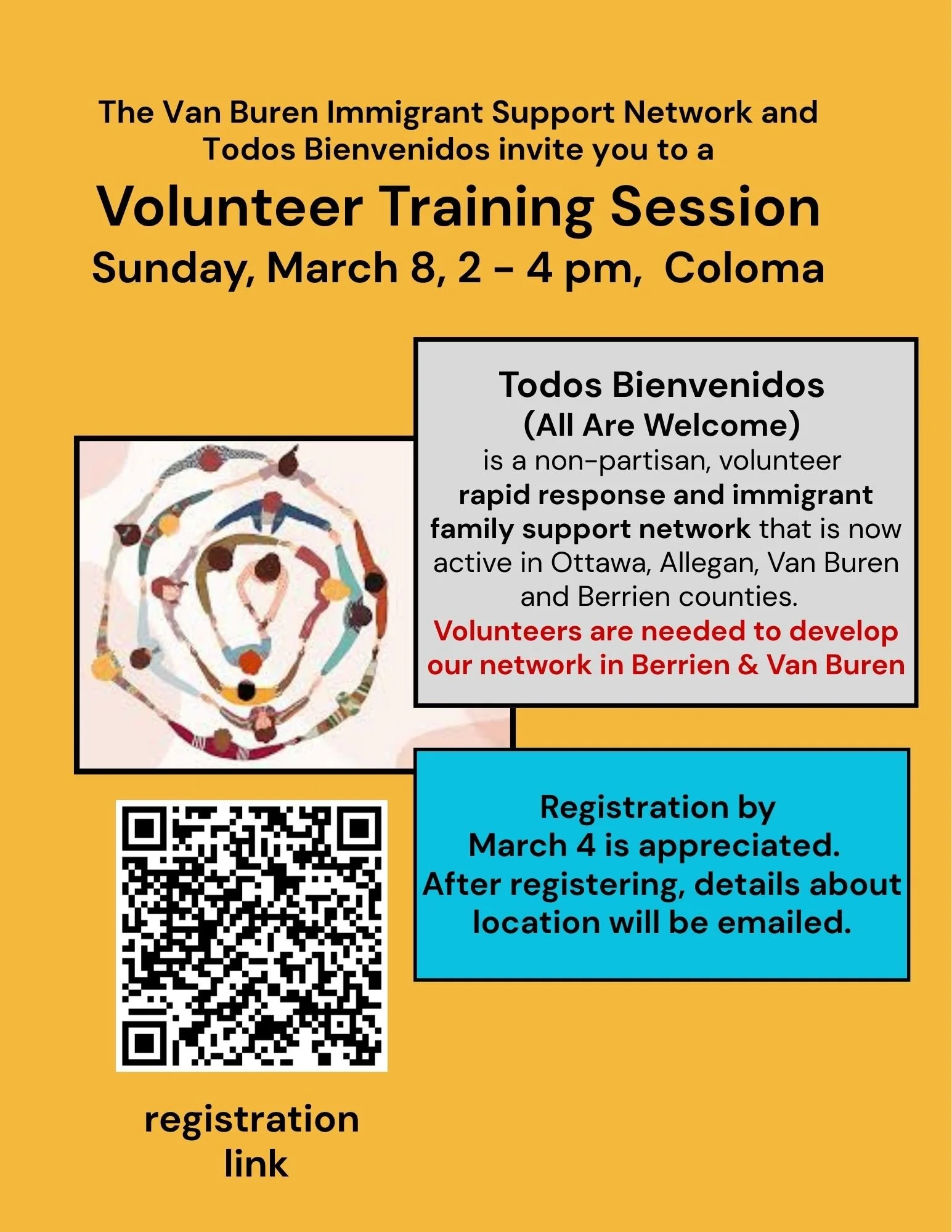Todos Bienvenidos (All Are Welcome), a non-partisan, volunteer active response and immigrant family support system is now active in Ottawa, Allegan, Van Buren and Berrien Counties. Each of these counties is continuing to recruit volunteers to help with these efforts.